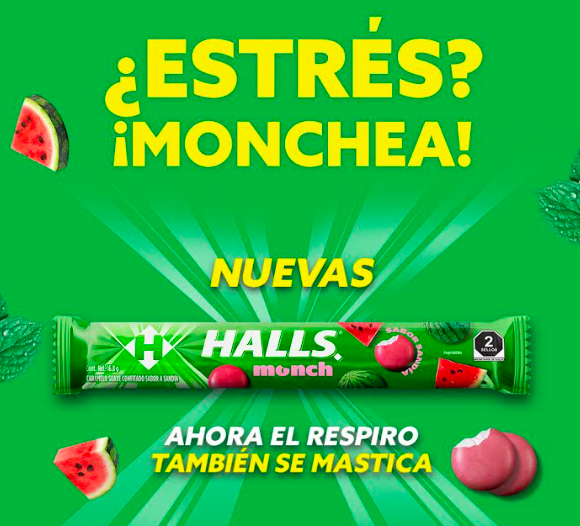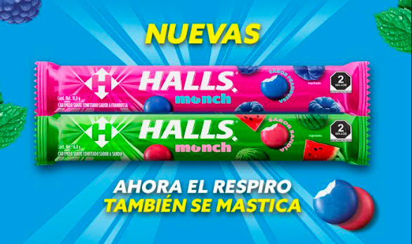 Halls Monch® brinda a los consumidores una nueva experiencia de consumo, con una mezcla de texturas en un caramelo suave con una cobertura confitada en sabores sandía y frambuesa con un toque del mentol característico de Halls®, convirtiéndolo en el producto perfecto para acompañarlos en los momentos en que necesitan monchear, es decir, darse un gustito entre comidas o disfrutar con amigos.