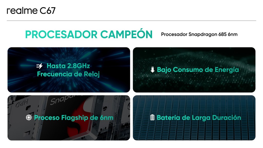 realme C67 cuenta con el chipset Snapdragon 685, que es el primer chipset Snapdragon 6nm en la serie C de realme, y logrando una impresionante puntuación Antutu de 330k. El chipset Snapdragon 685 está optimizado para la potencia y la eficiencia, para una experiencia de teléfono que es agradablemente suave y estable incluso en tareas exigentes. En comparación con el realme C55, el realme C67 ofrece un aumento del 15% en el rendimiento de la CPU y del 10% en el rendimiento de la GPU, junto con una impresionante frecuencia principal de 2,8 GHZ.