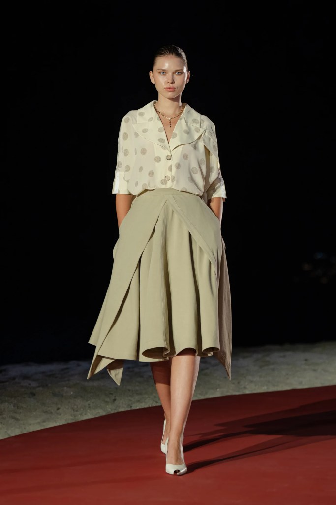 La temporada en ALFREDO MARTINEZ se inspira en Nan Kempner, una filántropa y coleccionista de moda y arte. La colección refleja su estilo visionario y su curaduría de piezas importantes del siglo XX. Compuesta por 30 looks divididos en bloques, la colección captura el carácter y estilo de Kempner, ofreciendo una propuesta única de moda y estilo de vida. Los colores van desde el verde cazador al negro, con texturas de seda, encaje y piel, mientras que los complementos como zapatos altos de plataforma y accesorios dorados añaden un toque de elegancia y protagonismo al estilismo.
