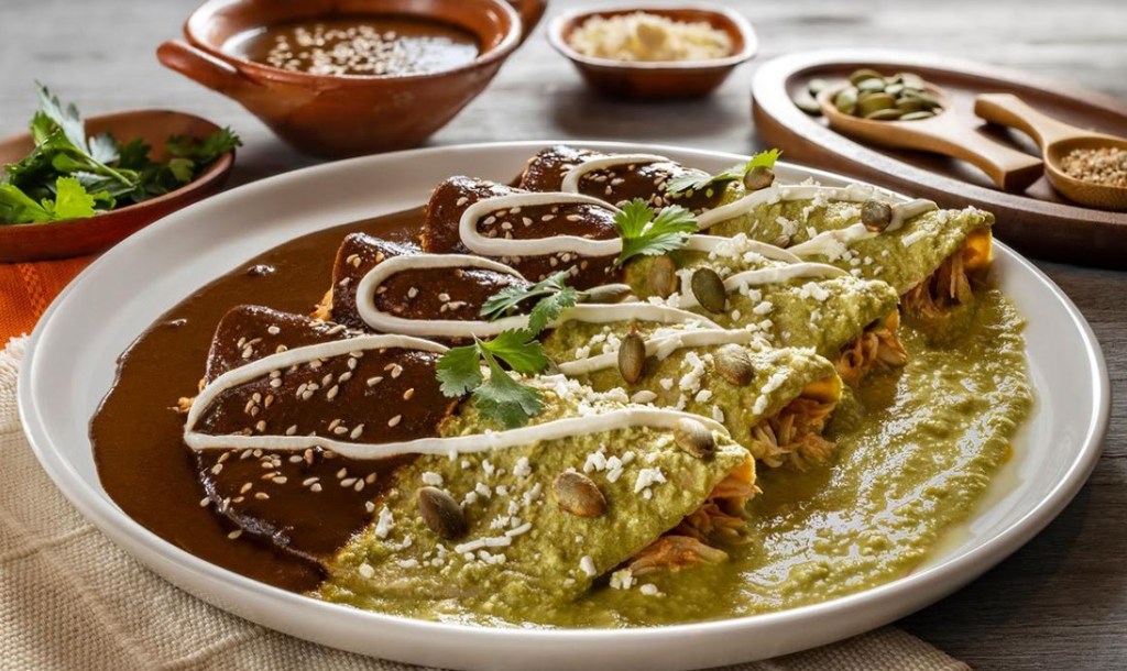– Las enchiladas bicolor: Sus deliciosas enchiladas con pollo bañadas con mole