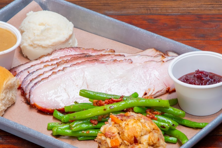 El menú para esta fecha tan especial es un banquete casero, fiel al estilo americano: pavo ahumado artesanalmente, cocinado por 8 horas y acompañado de los clásicos stuffing de pavo, puré de papa cremoso, ejotes salteados con tocino crujiente, salsa de arándano, gravy, pan para acompañar y una rebanada de pay a elegir entre calabaza, nuez o manzana. Todo esto acompañado de una bebida a elección, cerveza, vino o refresco.