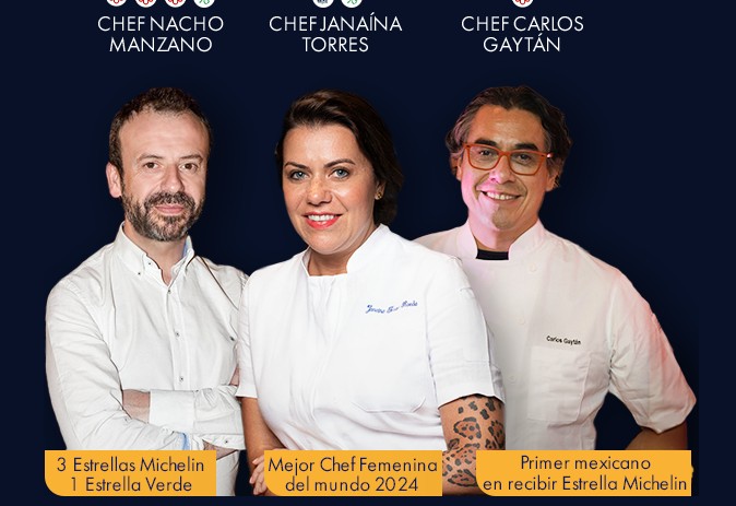 Nacho Manzano – Marcial Asturias, España; Miguel Angel de la Cruz – La Botica de Matapozuelos, Valladolid, España; Kisko García Córdoba, España; Rubén Sánchez Tomelloso, España; Carlos Gaytán Riviera Maya; Mario Hernández El Califa de León; Paco Ruano Alcalde, Guadalajara, Jalisco. Ellos y otros importantes chefs y mixólogos multipremiados con diversos reconocimientos internacionales engalanarán este gran evento.