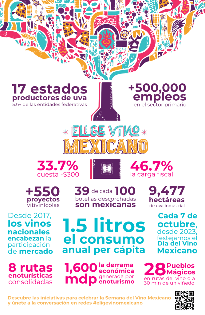 Desde 2023, por decreto oficial, cada 7 de octubre se conmemora el Día del Vino Mexicano. Para la tercera edición de esta efeméride, el Consejo Mexicano Vitivinícola une fuerzas nuevamente con la Cámara Nacional de la Industria de Restaurantes y Alimentos Condimentados (CANIRAC) y suma a la Secretaría de Turismo, el Senado de la República y la Escuela Mexicana de Sommeliers en el marco de la campaña Elige Vino Mexicano.