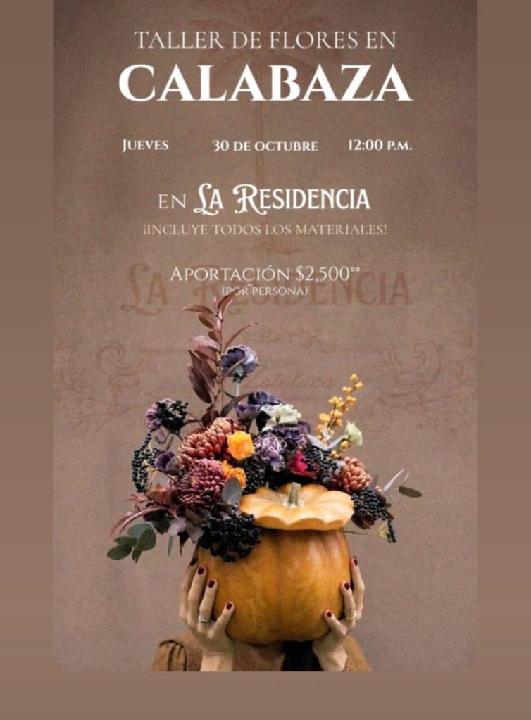 La calabaza naranja hoy es uno de los símbolos de estas festividades y destaca en las decoraciones de la temporada, por lo que si te gustaría saber como elaborar una calabaza festiva para estas fiestas, te recomendamos que asistas al taller que ofrece La Residencia Zotoluca este 30 de octubre. El taller incluye todos los materiales para que puedas decorar una calabaza con flores.