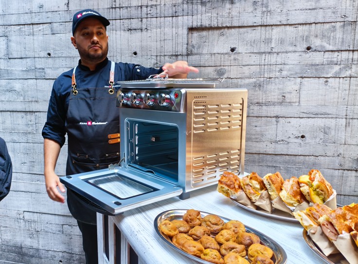 Después de los jugos, pasamos a degustar unos deliciosos sandwiches preparados por 2 jóvenes chefs con ingredientes saludables como jamón, queso, verduras en pan de masa madre. La particularidad de la preparación es que los colocaron en el Horno con Freidora de Aire HFKM-1400 IN, que minimiza el uso de grasas y reduce el tiempo de cocción, liberando minutos valiosos para el autocuidado. El queso se fundió perfectamente y quedaron muy apetitosos. Tiene una capacidad de 25 L que te permiten preparar la comida de toda la familia y rostizar un pollo entero en su interior. Sus 7 funciones en 1 con la ayuda de sus 5 programas de cocción te permitirán escoger los que más se adapten al resultado que desees. También probamos unas ricas galletas que se cocieron en unos 8 minutos, porque tiene sistema de convección y resistencias. Así no tienes que prender un horno de gas más grande. Tiene termostato regulable con alto rango de ajuste desde 40°C hasta 230°C. Su tamaño es bastante práctico a pesar de la gran gama de funciones que tiene. Incluye diversos accesorios.