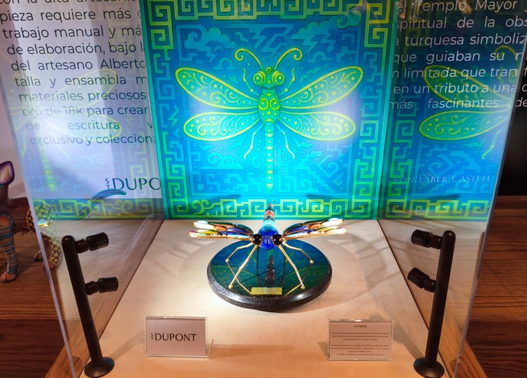 ¡Una pluma que es un increíble objeto de arte, un hermoso objeto decorativo y una obra de arte de orfebrería!. Una especie de libélula que representa a un Alebrije, diseñada por S.T. Dupont, uno de los fabricantes de plumas finas más reconocido del mundo. Es un diseño que te impresionará por su belleza, colorido y la calidad de su manufactura. Ha sido elaborada a mano por maestros expertos, utilizando nobles materiales naturales como el jaspe, turquesa, jade nefrita, ojo de tigre, jaspe rojo, lapislázuli, labradorita, zolsita, índigo gabbro y rubí. Solo se fabricaron 8 piezas numeradas.