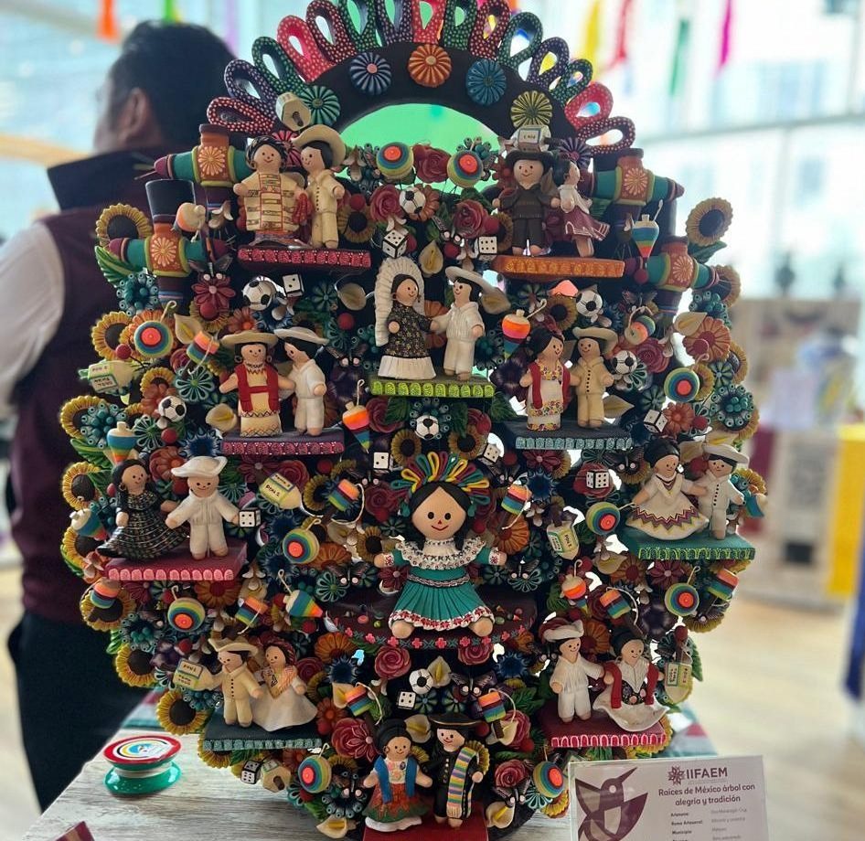 Por su parte, la propuesta de Zaira Salvador Miramón lleva la cartonería a nuevos niveles de detalle a través de la técnica del papel aglutinado. Sus creaciones incluyen sirenas, muñecas y los tradicionales alebrijes, los cuales dan vida a la cosmovisión y los personajes representativos del Valle de Toluca. Asimismo, el artesano José Adolfo Soto Díaz presenta la maestría del barro policromado de Metepec. Sus célebres Árboles de la Vida, junto con cruces, vírgenes y catrinas, son un despliegue de color y simbolismo que narran la historia y el misticismo de su municipio.