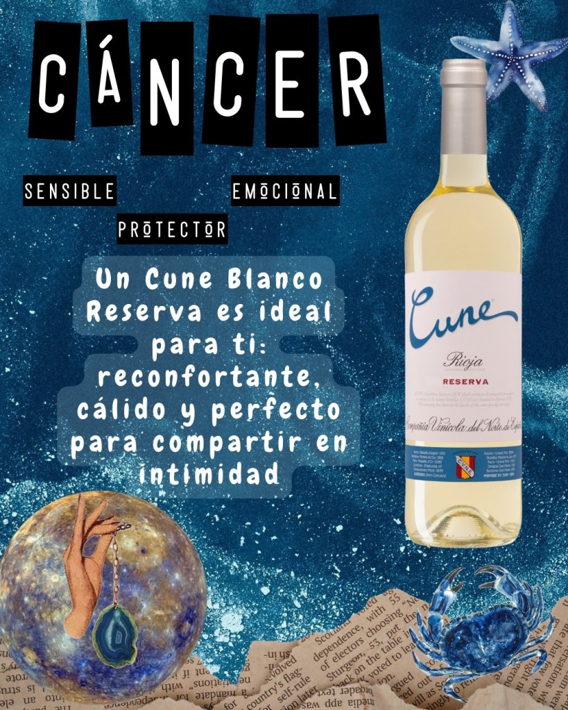CÁNCER: Eres sensible, protector y profundamente emocional, eliges lo que conecta con el corazón. Un Cune Blanco Reserva es ideal para ti: reconfortante, cálido y perfecto para compartir en intimidad.
