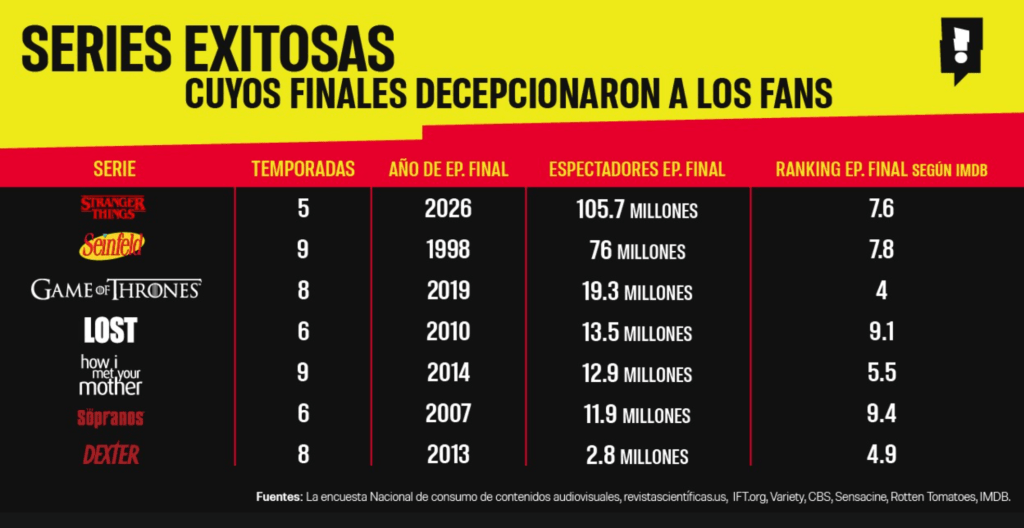 El desenlace de Stranger Things, lanzado el 31 de diciembre de 2025, provocó una polarización inmediata sobre si representó el cierre adecuado para Eleven y su grupo. Sin embargo, la plataforma de entretenimiento Spoiler, más allá de ahondar en teorías como la Conformity Gate, que señalaba la posibilidad de que todo se tratara de una ilusión creada por Vecna, y que habría otro episodio final tramado por los Duffer, descubrió qué hay detrás de la inconformidad de los espectadores por los cierres y qué otros finales han dejado al público con un sabor agridulce.