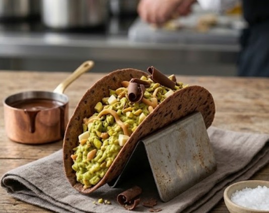 Por su parte, el taco, símbolo indiscutible de la cultura gastronómica mexicana, también entra al terreno del cacao. Desde tortillas infusionadas con cacao hasta versiones dulces rellenas de fruta fresca, crema batida y chocolate fundido, el formato taco demuestra que puede trascender lo salado sin perder identidad. El resultado: recetas híbridas que apelan a la nostalgia y al antojo contemporáneo.