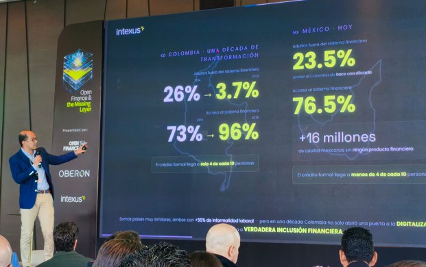 David Rojas Peralta de Intexus presentó un caso real de inclusión financiera llevado a cabo en Colombia. En ese país hace una década, muchas personas tenían que esperar para ver si obtenían un crédito, perdiendo tiempo y frustrándose. Hay personas que son invisibles para el sistema financiero: en 2014 26% de los adultos estaba fuera del sistema, en 2025, solo son 3.7%. El crédito formal solo llega a 4 de cada 10 personas. En México hoy, 23% de la población están fuera y hay más de 16 millones de personas sin algún producto financiero y el crédito llega a menos de 4 personas por cada 10. Obtener un crédito podía tardar por lo menos 3 a 5 días, con Intexus tarda solo 20 minutos. Un retail se convirtió en el segundo emisor de tarjetas de crédito, logrando que 36% de sus clientes (1.9 millones), accedieran al sistema financiero por primera vez, aunque no tenían un empleo formal. Las personas acumulaban puntos por compras pero sin opción de crédito. Mediante el hábito de consumo de esos puntos observaron una capacidad de pago, si compraba 300 dólares, se le podía dar crédito por 1,000 dólares. Se le entregaba una tarjeta de crédito para compras en ese retail y en otros comercios. Esas personas consideradas como de alto riesgo, realmente tienen un mejor comportamiento de pago que otras porque son agradecidas y la cartera de este retail es mucho mejor que la de la banca tradicional. Estas tarjetas tienen un uso inmediato al 100 % cuando las de entidades bancarias pueden quedar sin activar hasta en 33% por la espera. El término Open Finance no existía hace 10 años pero es una tendencia que ya se empieza a replicar en Latino América, se entrega crédito de manera inmediata, hay varios casos de éxito, lo importante es empezar a escalar. Intexus llega a México de la mano de Oberon en el momento preciso, donde el mercado está listo, donde hay una regulación, donde el sistema está avanzando y podemos traer la pieza que hacía falta en este rompecabezas, para empezar el open finance de manera masiva y dar una inclusión financiera en la región. Hay más de 20 millones de personas allá afuera esperándonos. La infraestructura existe, el modelo existe y el aliado existe.