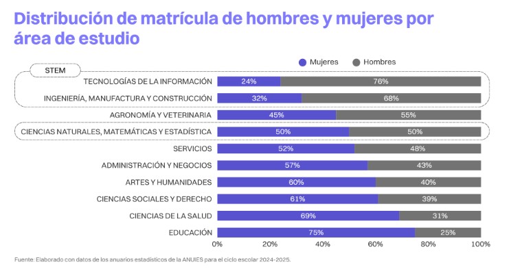Las mujeres se concentran en áreas de estudio como educación (75%), ciencias de la salud (69%) y ciencias sociales y derecho (61%). En contraste, los hombres se inclinan en mayor medida por carreras STEM, particularmente en tecnologías de la información (76%) e ingeniería, manufactura y construcción (68%)