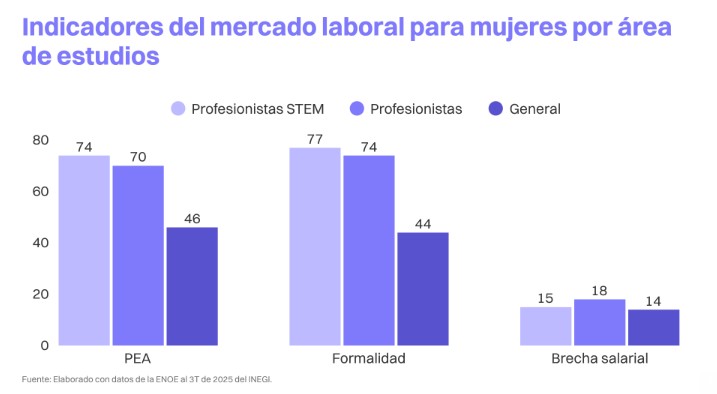 - Empleos de calidad. 77% de las mujeres STEM trabaja en la formalidad, frente a 74% de las profesionistas, lo que implica mayor acceso a seguridad social, ahorro para el retiro y servicios como guarderías.