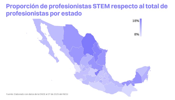 Las brechas entre entidades federativas en materia de talento STEM son significativas. Coahuila y Querétaro lideran a nivel nacional: 18% de sus profesionistas se dedican a áreas STEM, casi una de cada cinco. En el extremo opuesto, Colima registra la menor participación de mujeres STEM, con apenas 8% de sus profesionistas en estas áreas.
