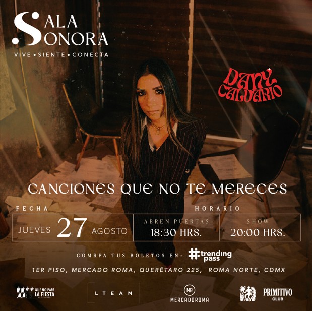 La cantautora Dany Calvario llegará a la CDMX el próximo jueves 27 de agosto para ofrecer un show íntimo y lleno de emoción en Sala Sonora, ubicada en el 1er piso de Mercado Roma, en la Roma Norte. Los boletos ya están disponibles a través de Trending Pass. Las puertas abrirán a las 18:30 hrs y el show comenzará a las 20:00 hrs, en una noche que promete una conexión única y muy especial con su público.